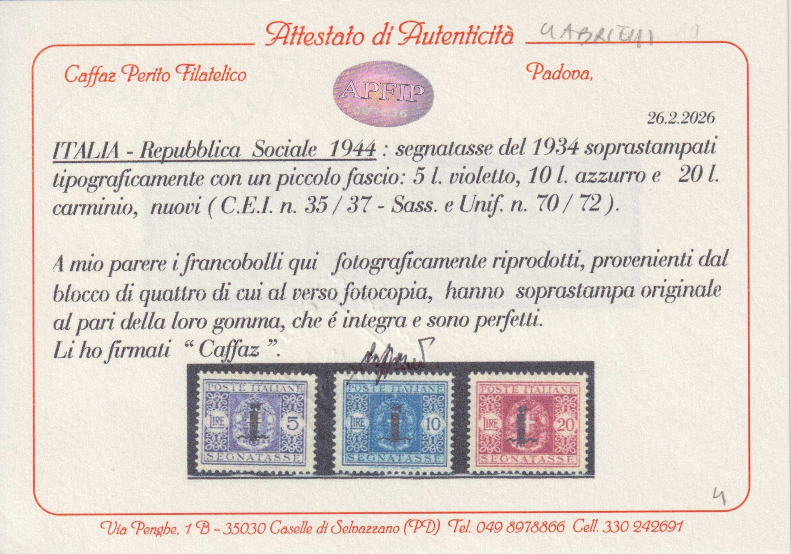 REGNO D'ITALIA 1944 SEGNATASSE FASCETTO M.N.H. CERT. CAFFAZ quantità
