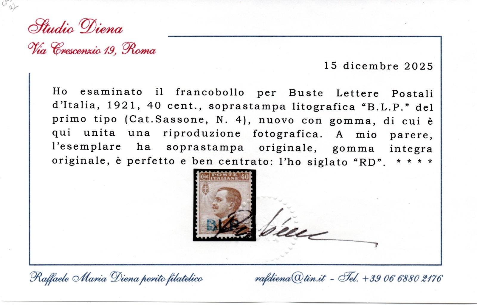 REGNO D'ITALIA B.L.P. 40 CENT 1921 MNH CERT DIENA quantità