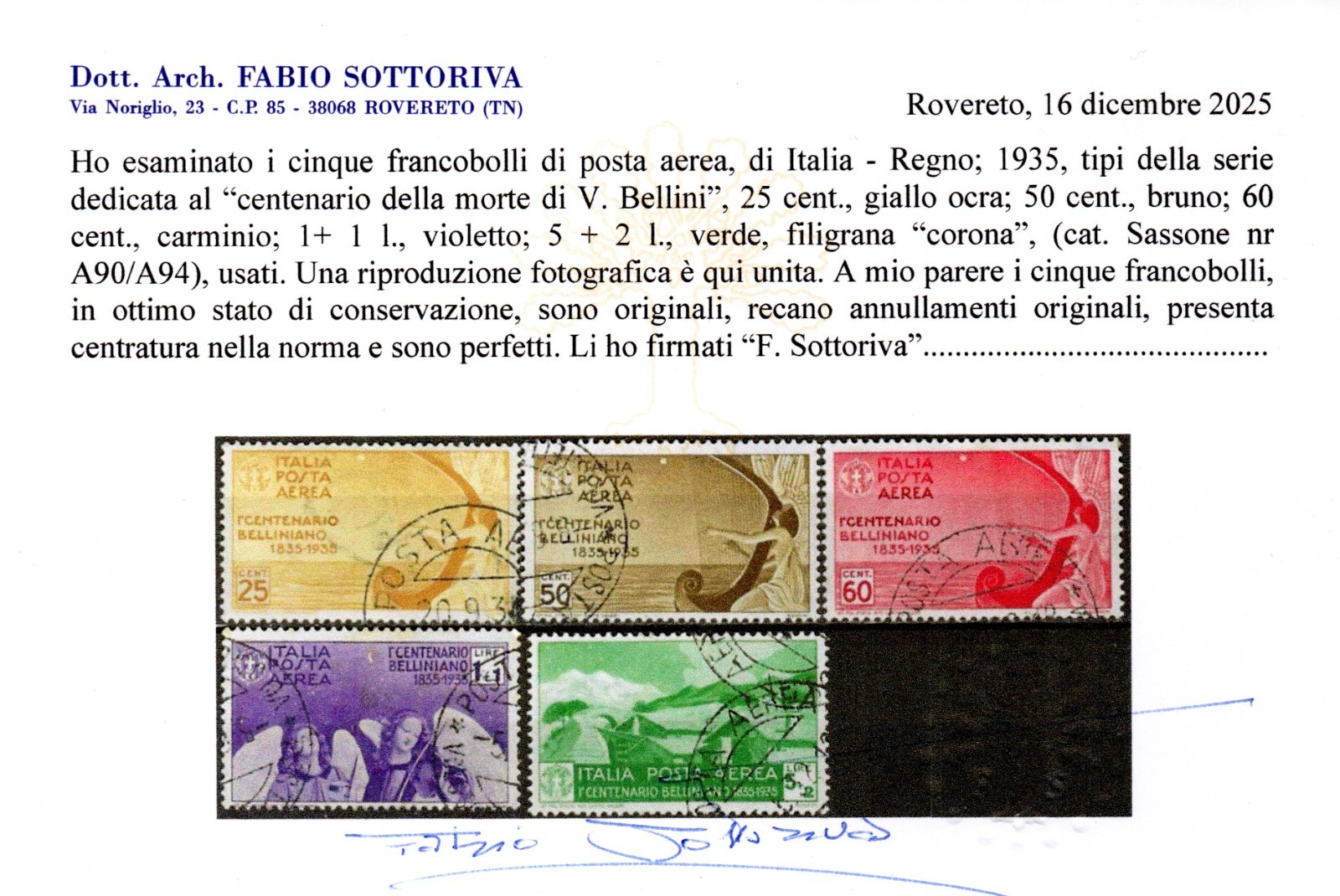 / REGNO D’ITALIA BELLINI 1935 ANNULLATI CERTIFICATO SOTTORIVA