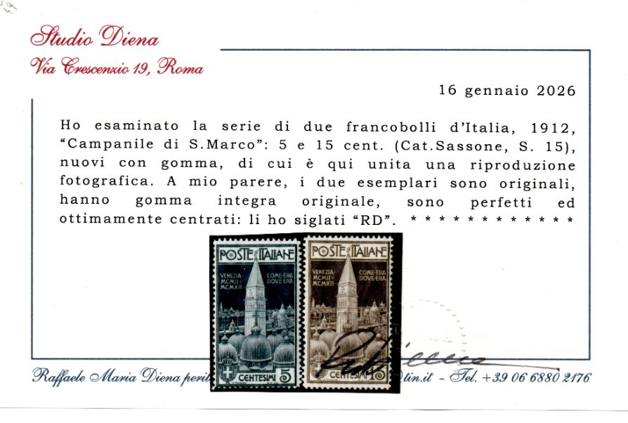 REGNO D’ITALIA CAMPANILE S.MARCO 1912 MNH CERT DIENA