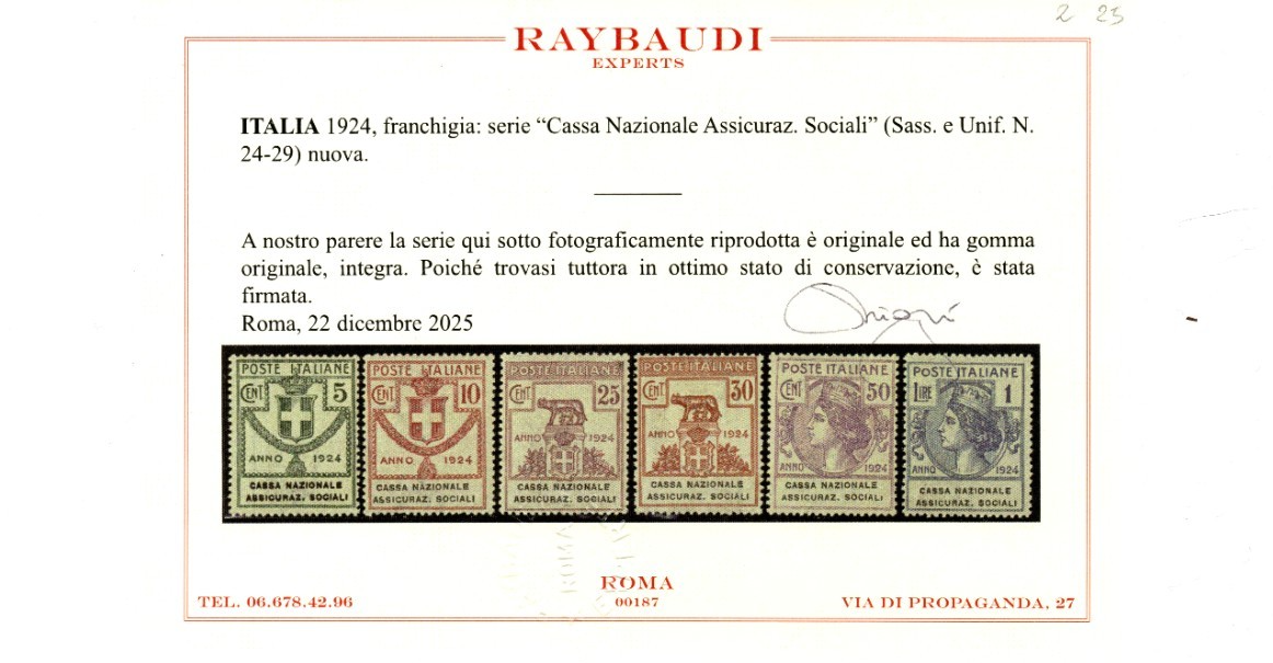 REGNO D'ITALIA CASSA NAZIONALE ASSICURAZIONI SOCIALI 1924 MNH CERT RAYBAUDI quantità