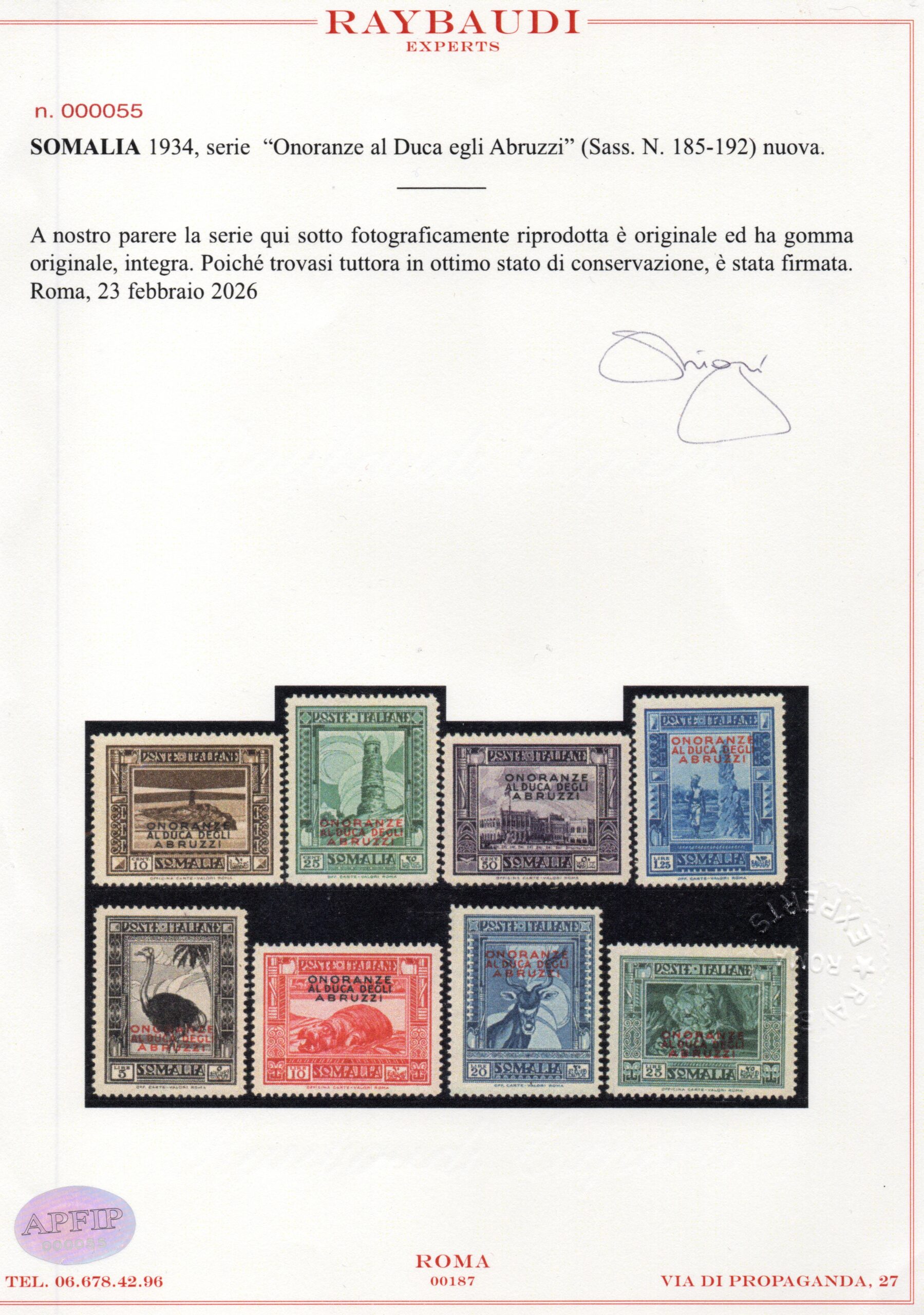 REGNO D'ITALIA - COLONIE SOMALIA ONORANZE DUCA ABRUZZI - 1934 - MNH - cert. Raybaudi quantità