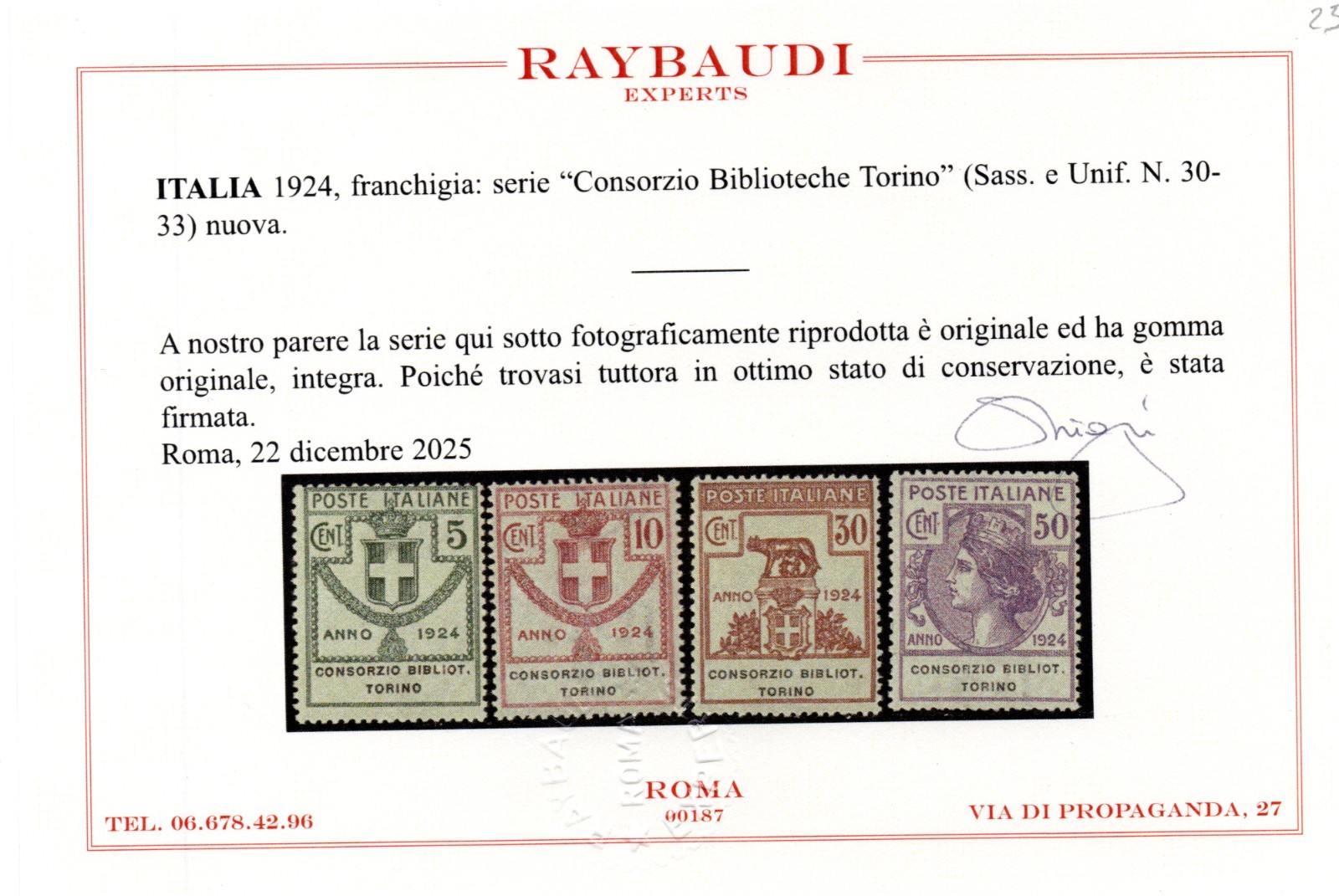 REGNO D'ITALIA CONSORZIO BIBLIOTECHE TORINO 1924 MNH CERT RAYBAUDI quantità