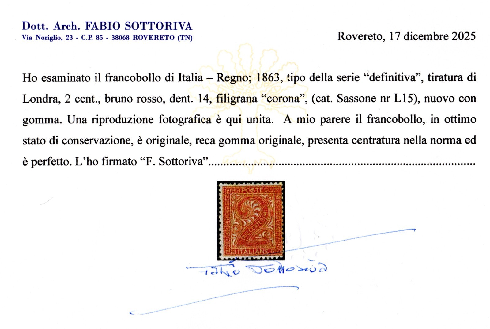 / REGNO D’ITALIA DE LA RUE 2C 1863 MH CERT SOTTORIVA