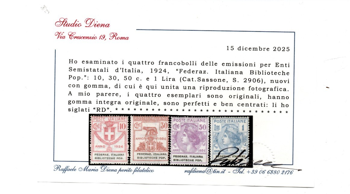 REGNO D'ITALIA FEDERAZIONE ITALIANA BIBLIOTECHE POP. 1924 MNH CERT DIENA quantità