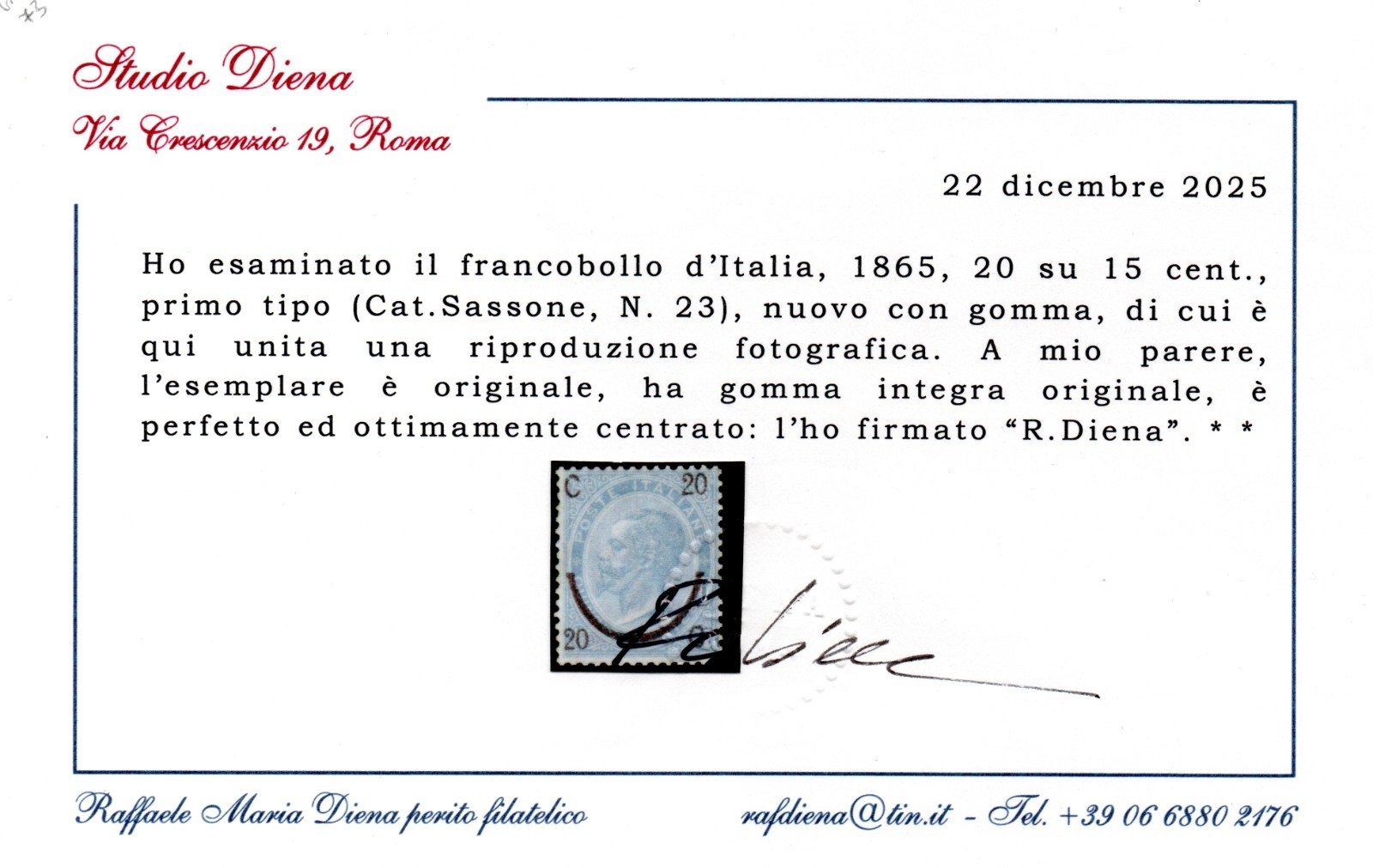 REGNO D’ITALIA FERRO DI CAVALLO 1° TIPO 1865 MNH CERT DIENA