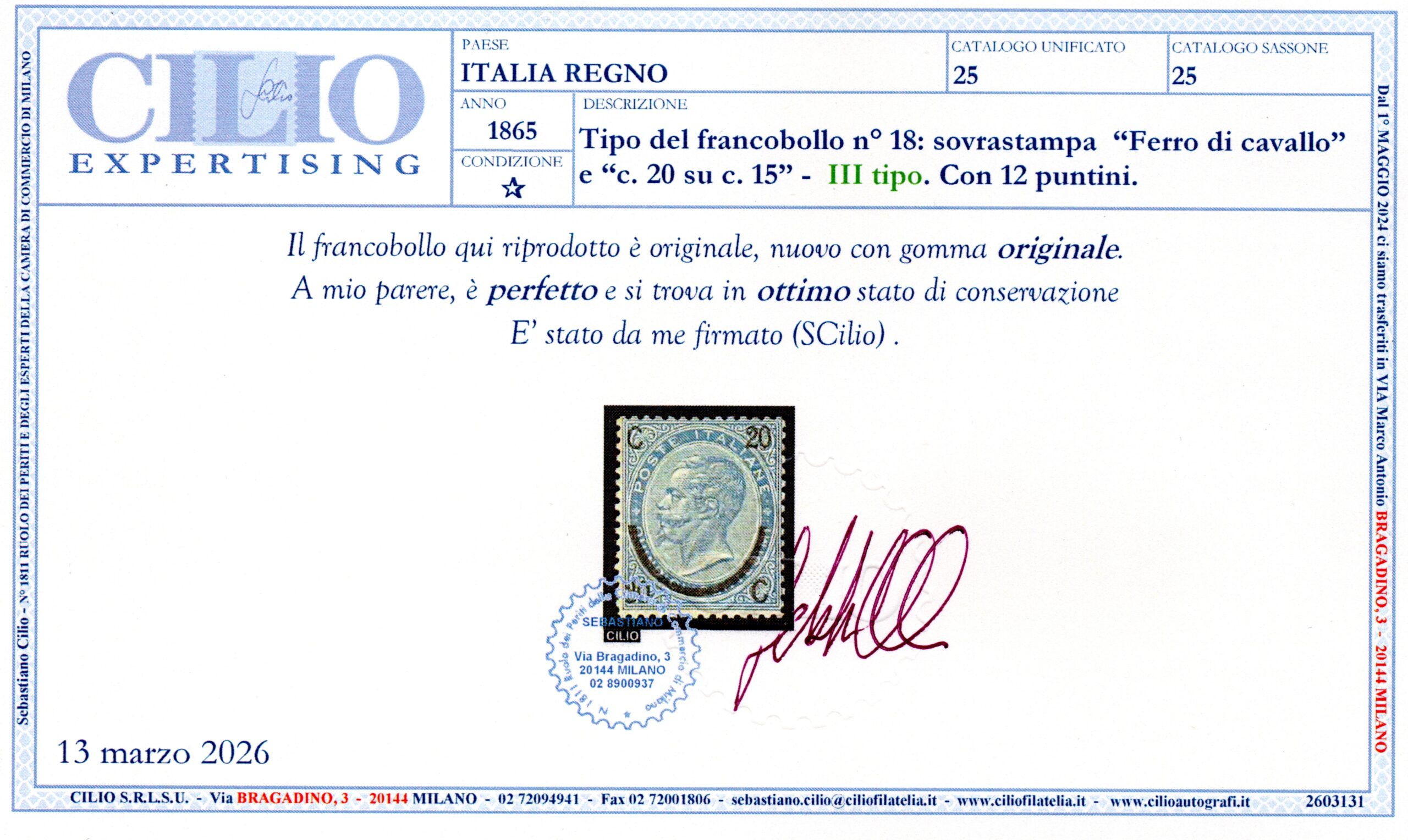 REGNO D’ITALIA – FERRO DI CAVALLO III TIPO – 1865 – MH – cert. Cilio