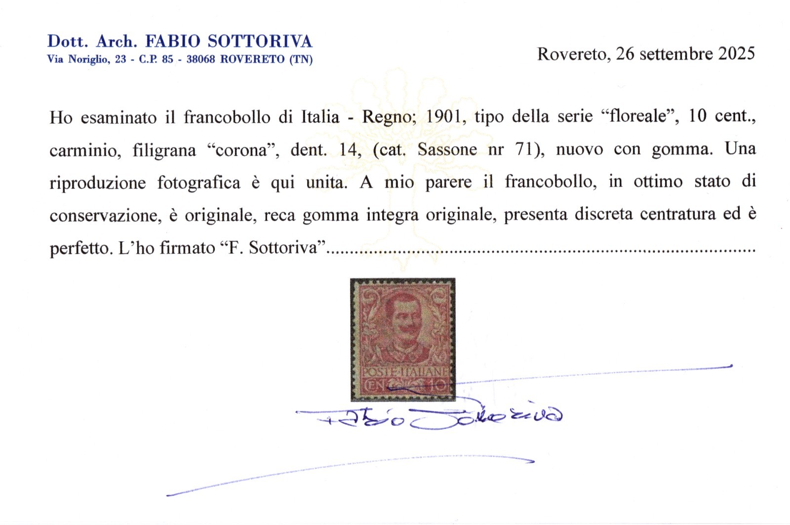REGNO D'ITALIA FLOREALE 10 CENT 1901 MNH CERTIFICATO SOTTORIVA quantità