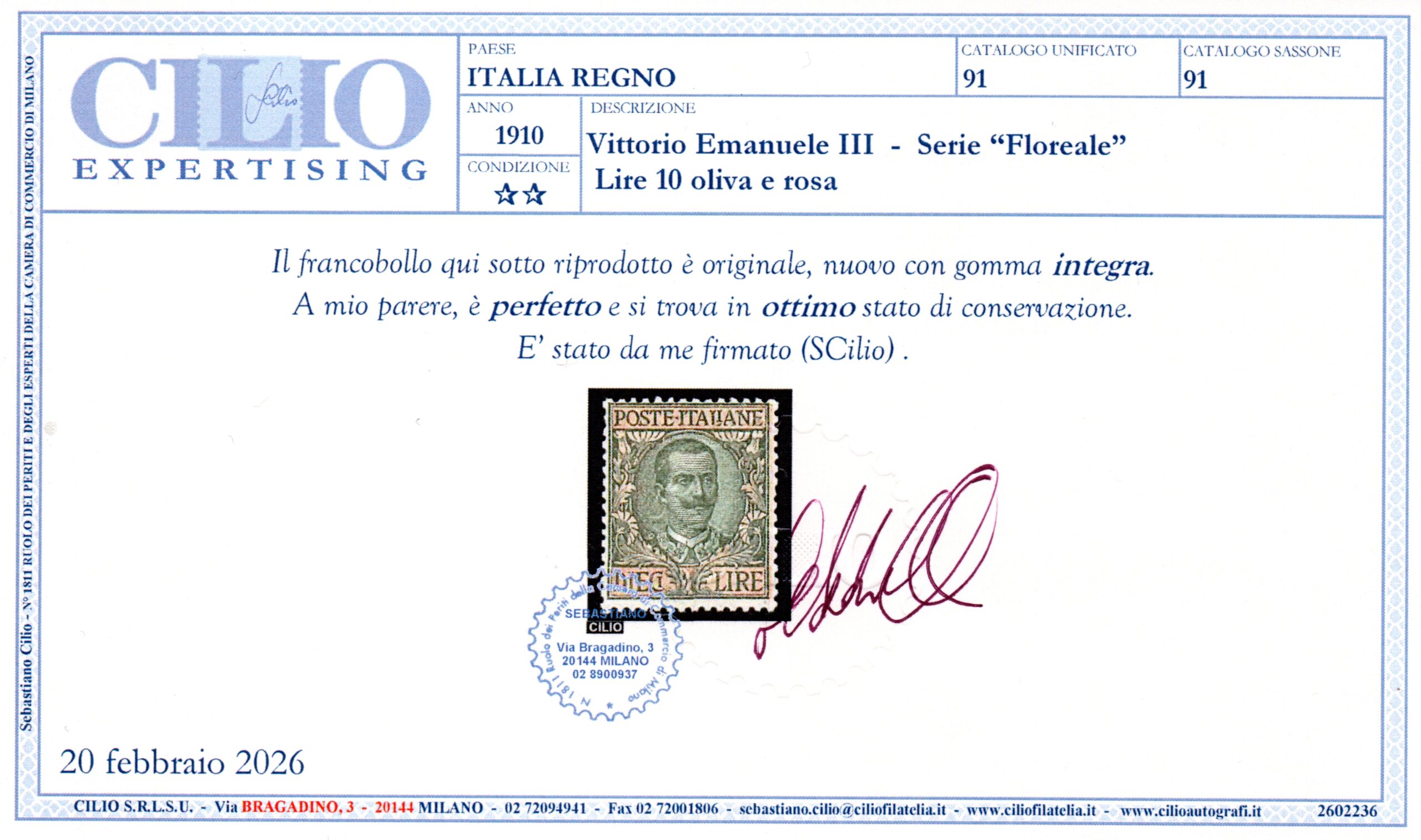REGNO D'ITALIA - FLOREALE 10LIRE - 1910 - MNH - cert. Cilio quantità