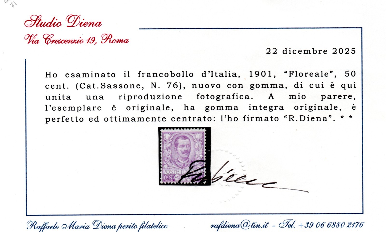 REGNO D’ITALIA FLOREALE C.50 1901 MNH CERT DIENA