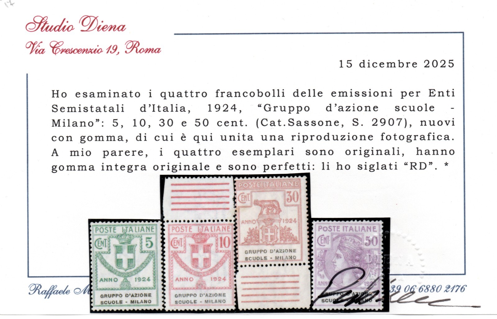 / REGNO D’ITALIA GRUPPO AZIONE SCUOLE MILANO 1924 MNH CERT DIENA