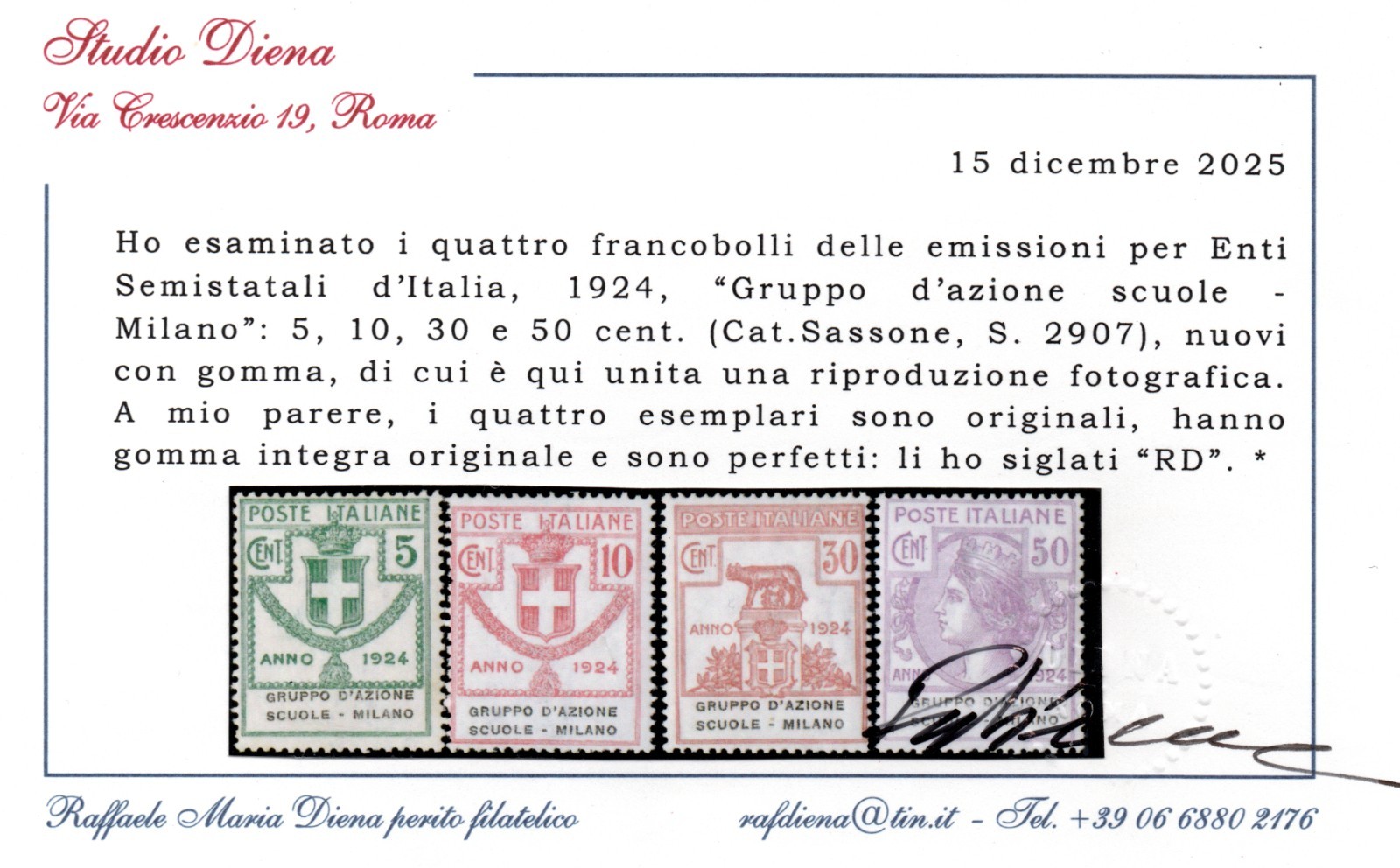/ REGNO D’ITALIA GRUPPO D’AZIONE SCUOLE MILANO 1924 MNH CERT DIENA