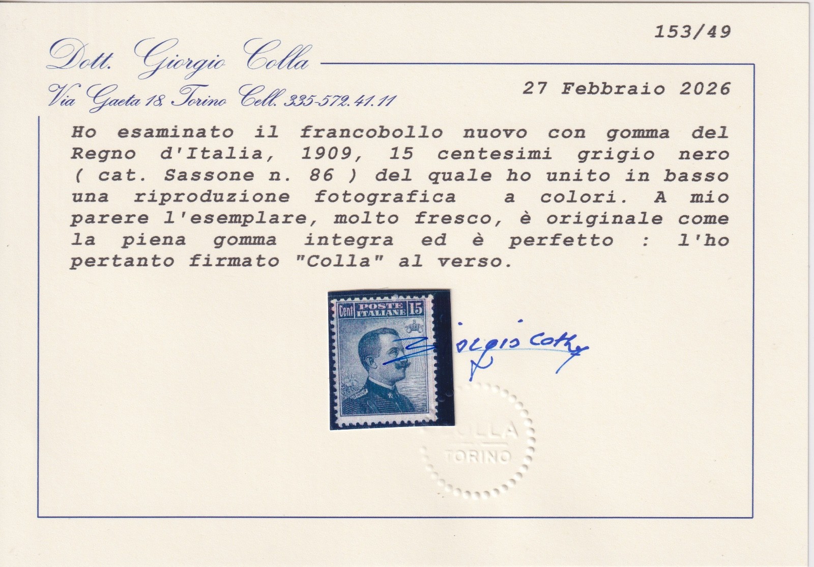/ REGNO D’ITALIA MICHETTI 1909 n.86 M.N.H. CERT. COLLA