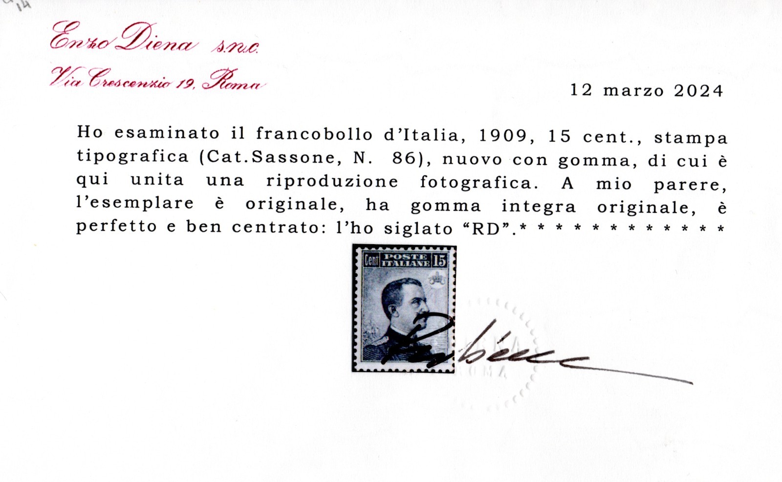 REGNO D’ITALIA MICHETTI N86 1909 MNH CERT DIENA