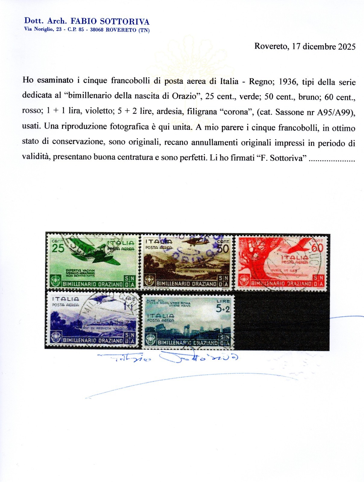/ REGNO D’ITALIA ORAZIO 1936 ANNULLATO CERTIFICATO SOTTORIVA