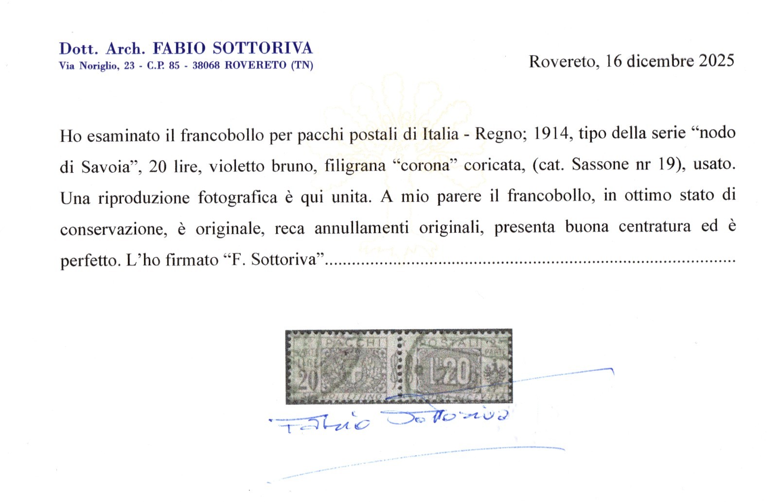 REGNO D'ITALIA PACCHI NODO 1914 ANNULLATO CERTIFICATO SOTTORIVA quantità