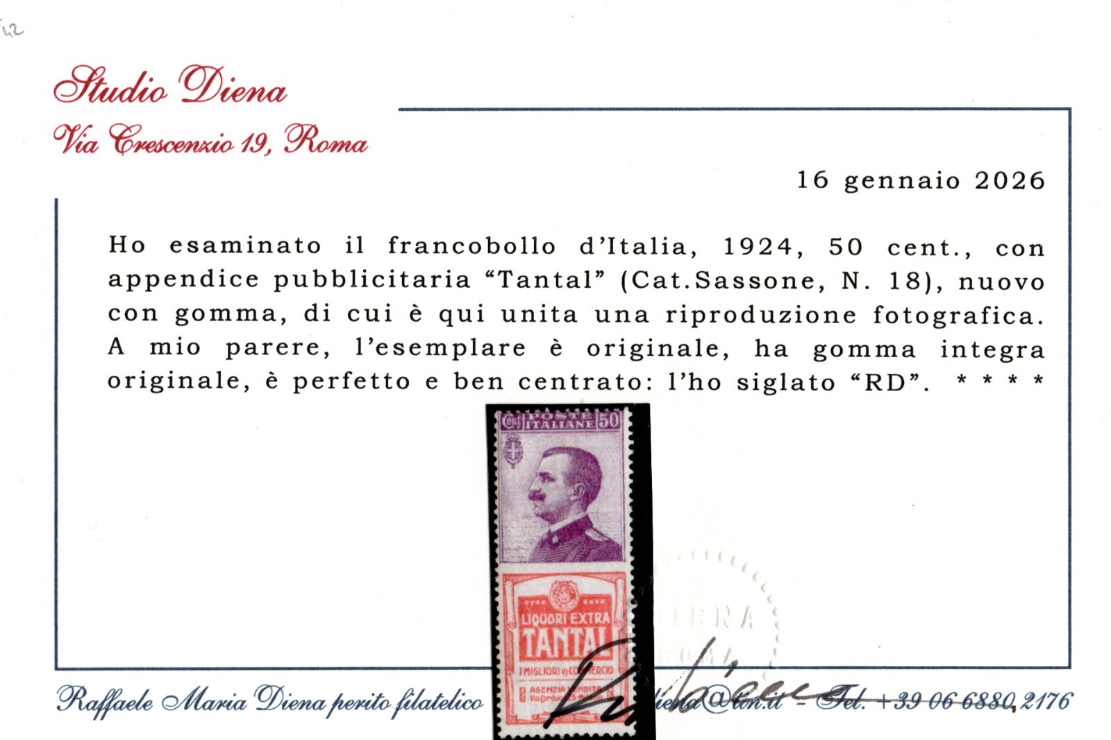 REGNO D'ITALIA PUBBLICITARIO TANTAL 1924 MNH CERT DIENA quantità