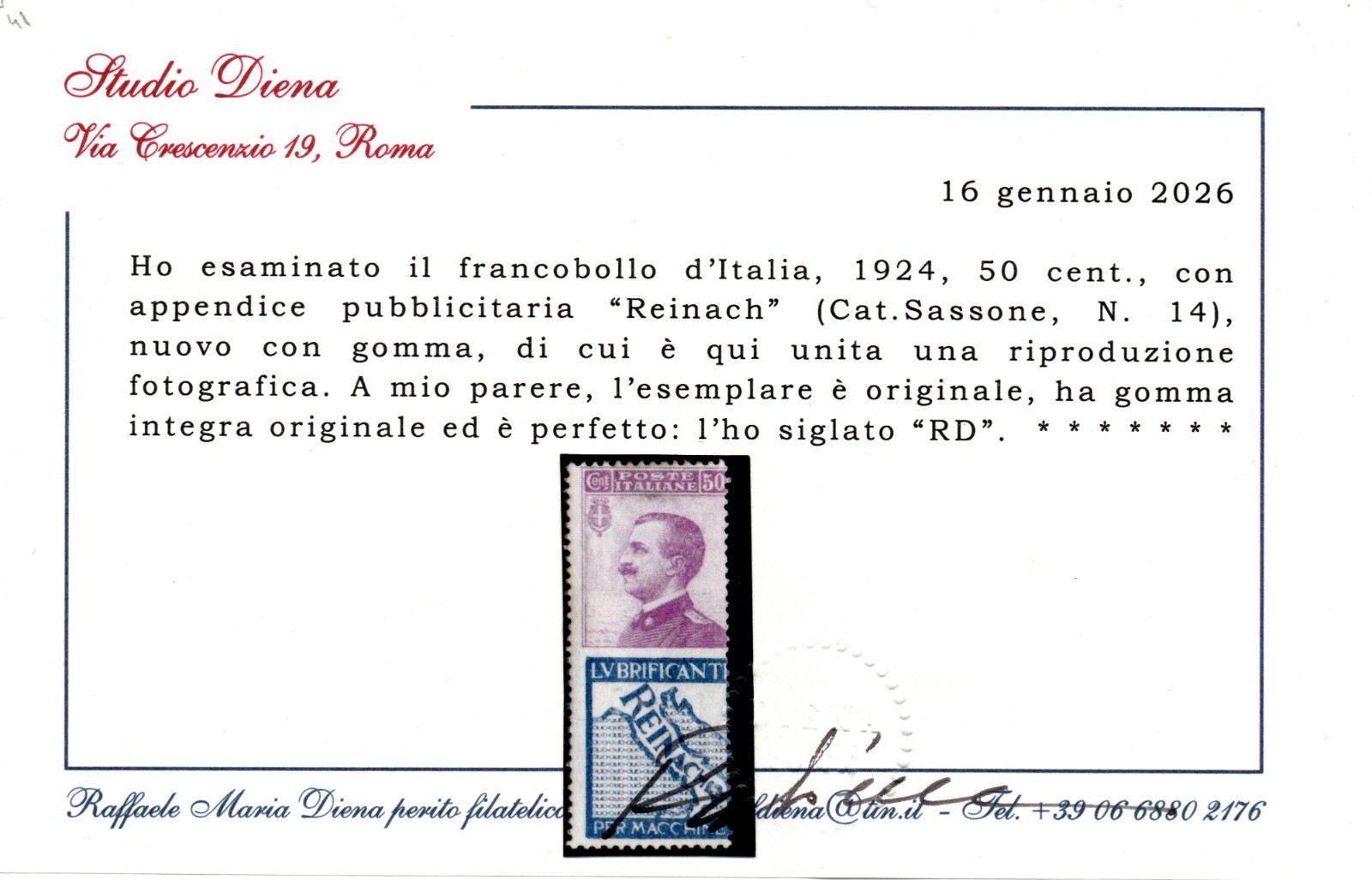 REGNO 1928 – Stemma d’Italia e fascio RECAPITO AUTORIZZATO MNH CERTIFICATO DIENA