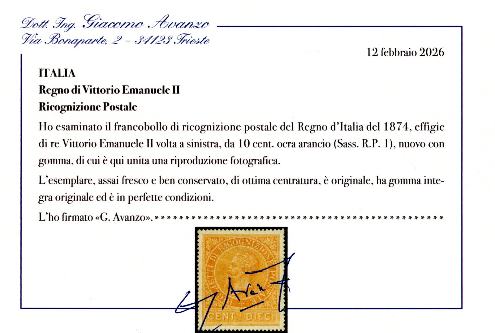 REGNO D'ITALIA RICOGNIZIONE POSTALE 1874 MNH CERT AVANZO quantità