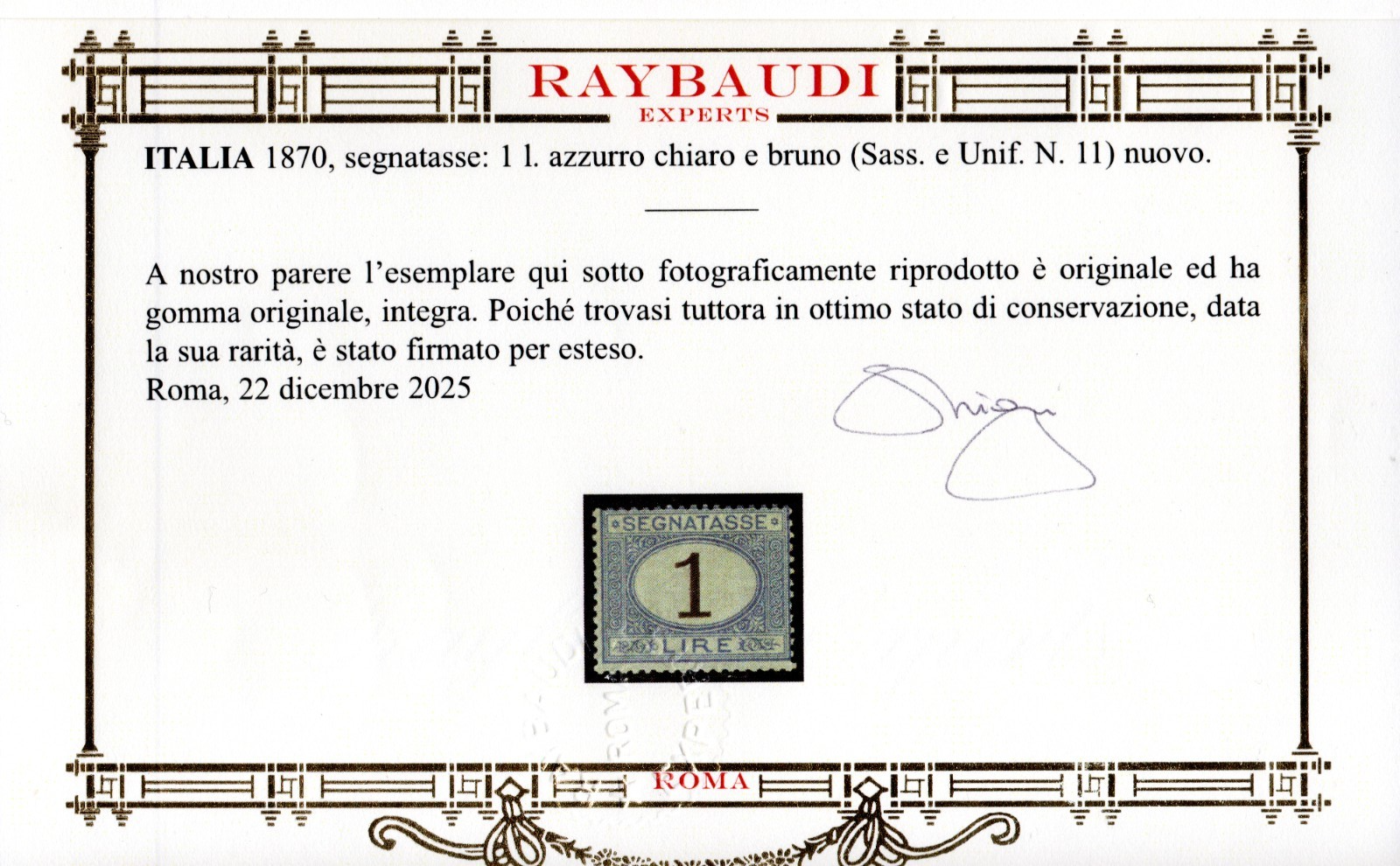 REGNO D’ITALIA SEGNATASSE 1870 MNH CERT RAYBAUDI