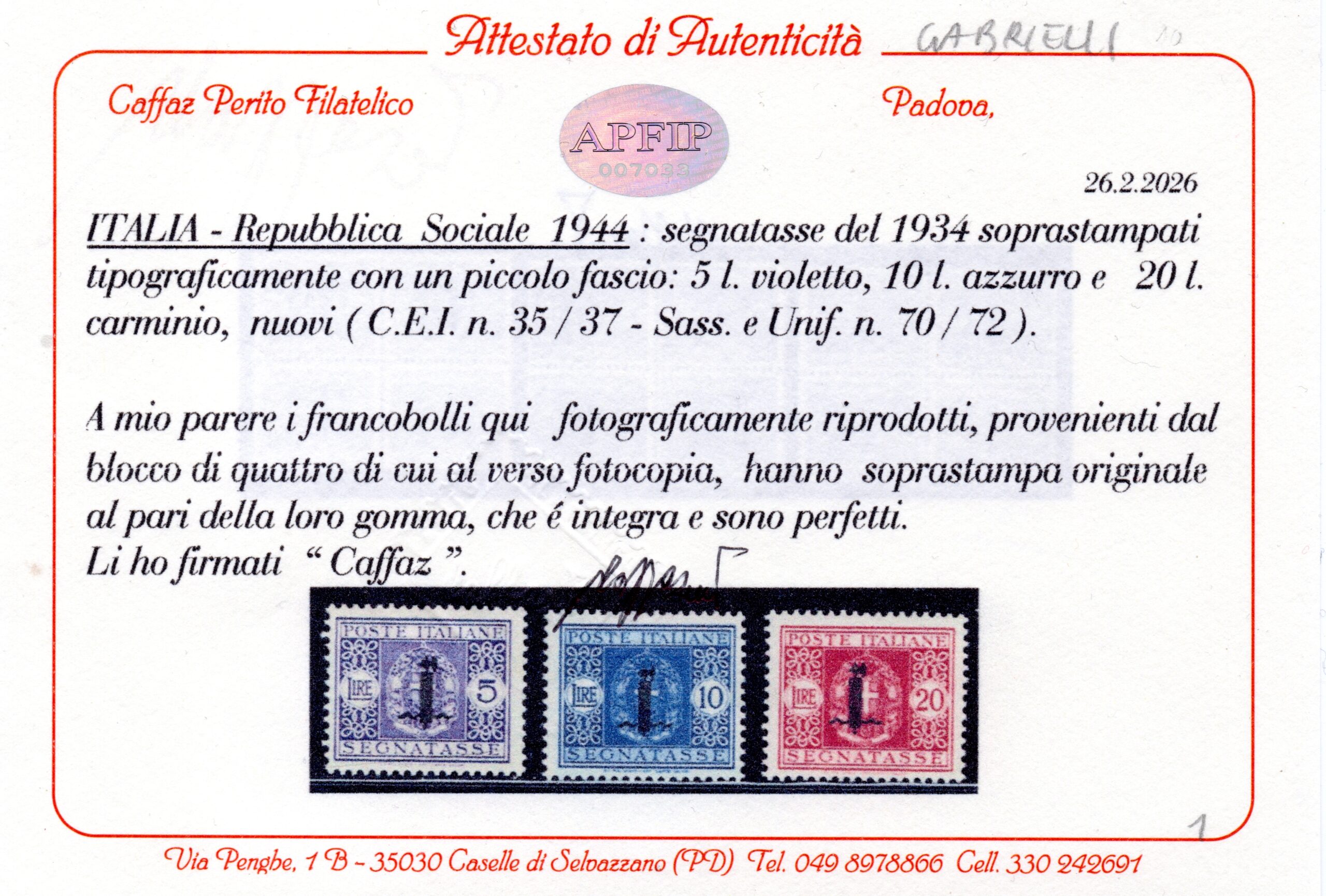 1944 SEGNATASSE REPUBBLICA SOCIALE ITALIANA G.N.R. MNH CERTIFICATO DIENA