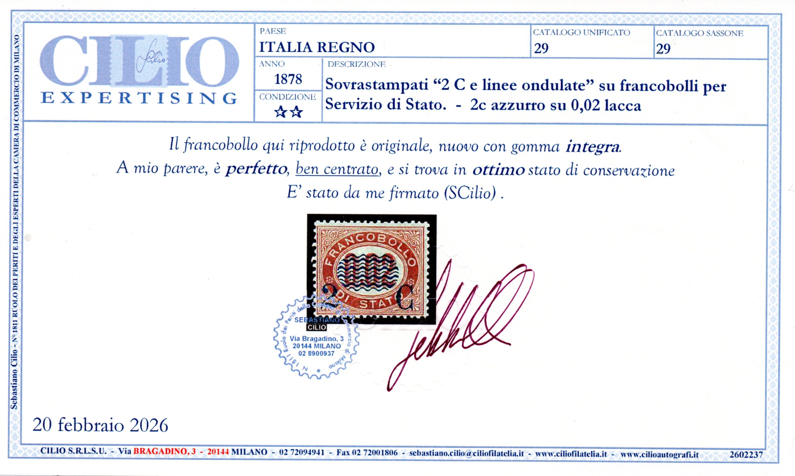 Regno servizio di Stato 1878 sovrastampato 2C su 0,20 MNH certificato Sottoriva