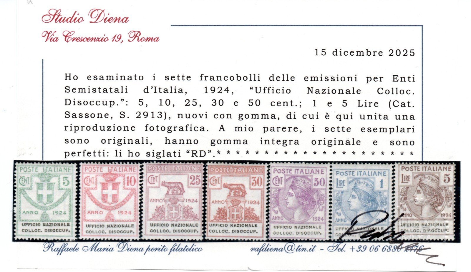 REGNO D'ITALIA UFFICIO NAZIONALE COLLOCAMENTO DISOCCUPATI 1924 MNH CERT DIENA quantità