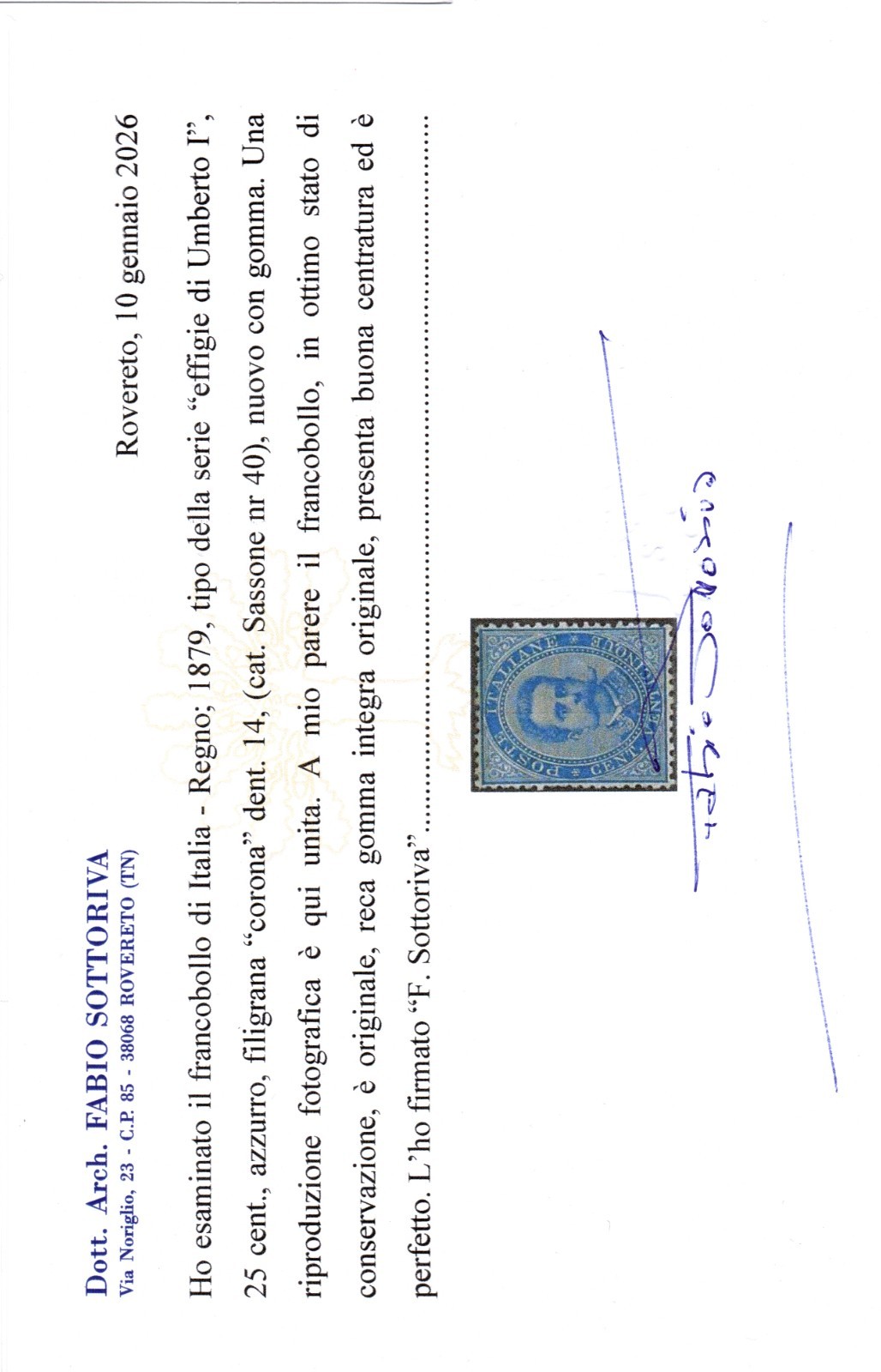 REGNO D'ITALIA UMBERTO 1° 25 CENT 1879 MNH CERT SOTTORIVA quantità