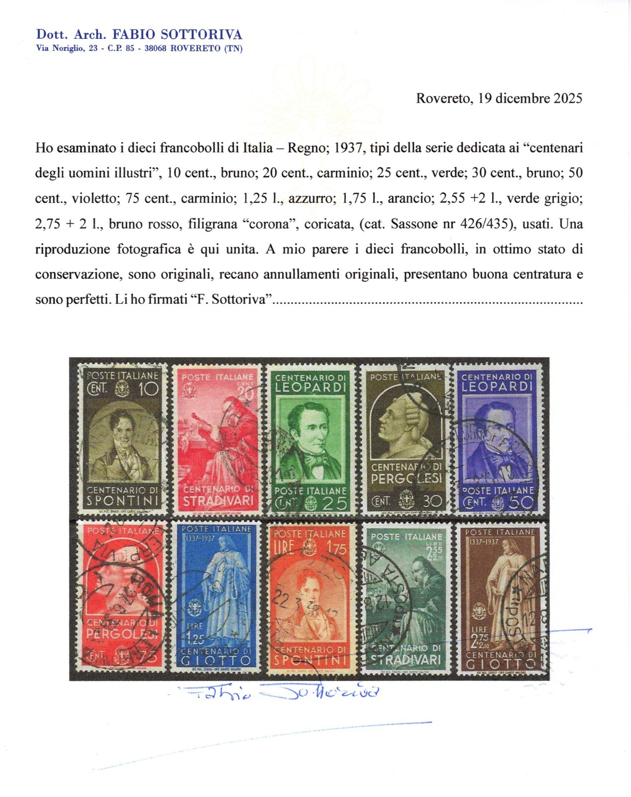 / REGNO D’ITALIA UOMINI ILLUSTRI 1937 ANNULLATO CERTIFICATO SOTTORIVA