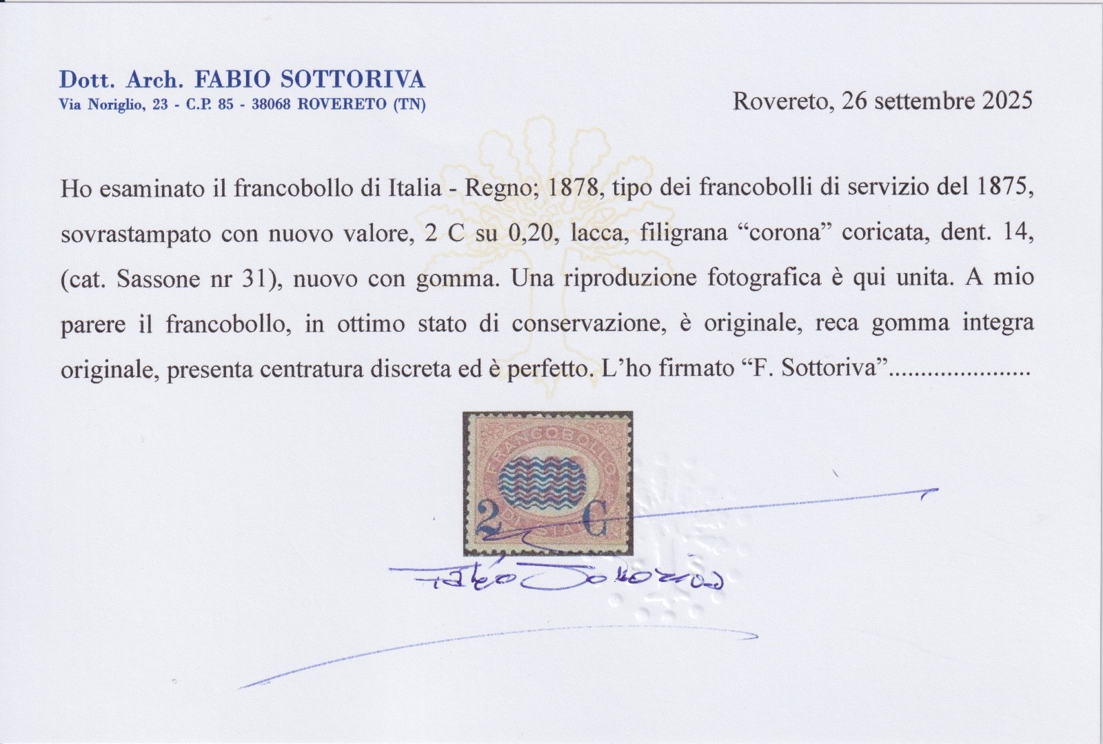Regno servizio di Stato 1878 sovrastampato 2C su 0,20 MNH certificato Sottoriva