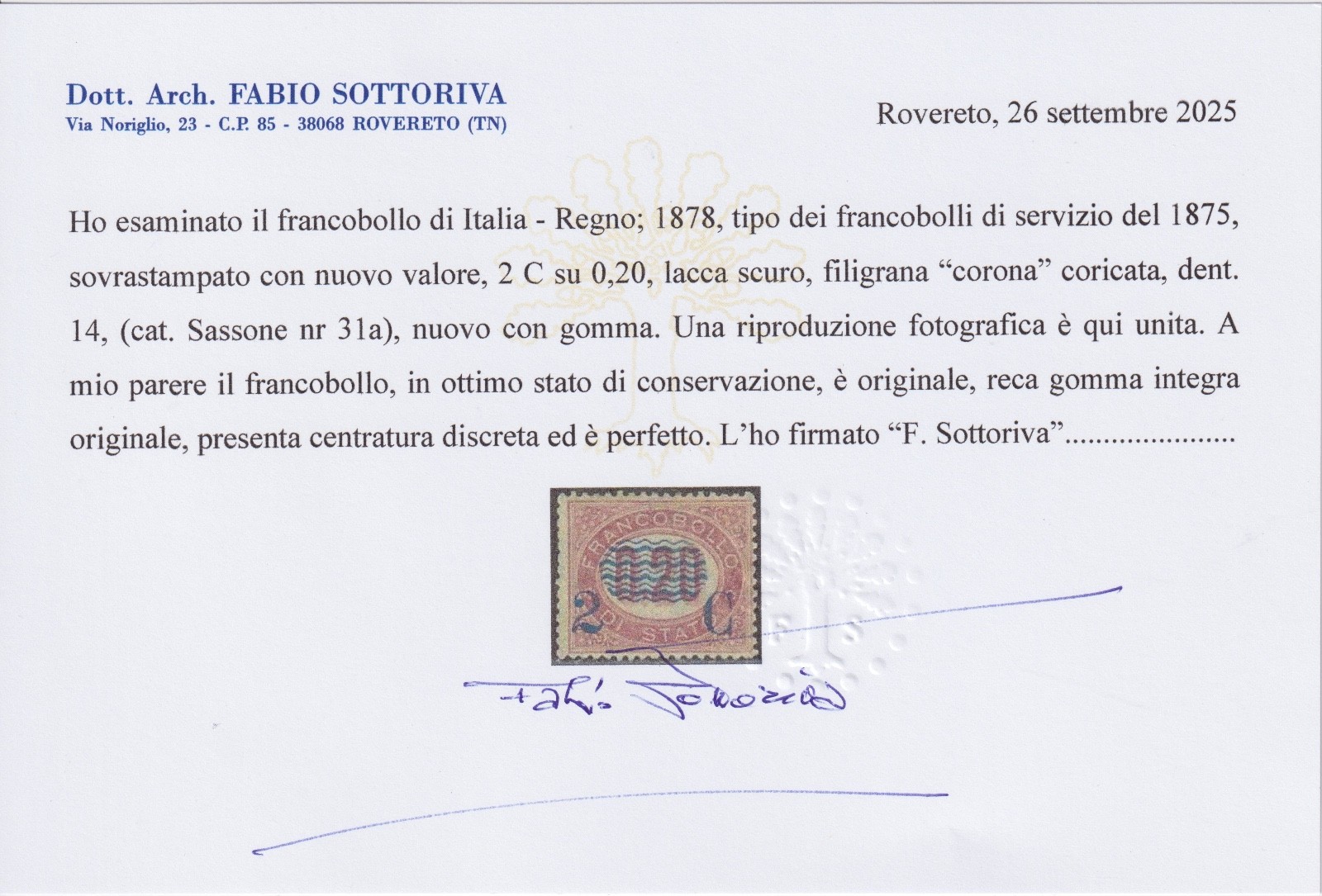 Regno servizio di Stato 1878 sovrastampato 2C su 0,20 MNH certificato Sottoriva