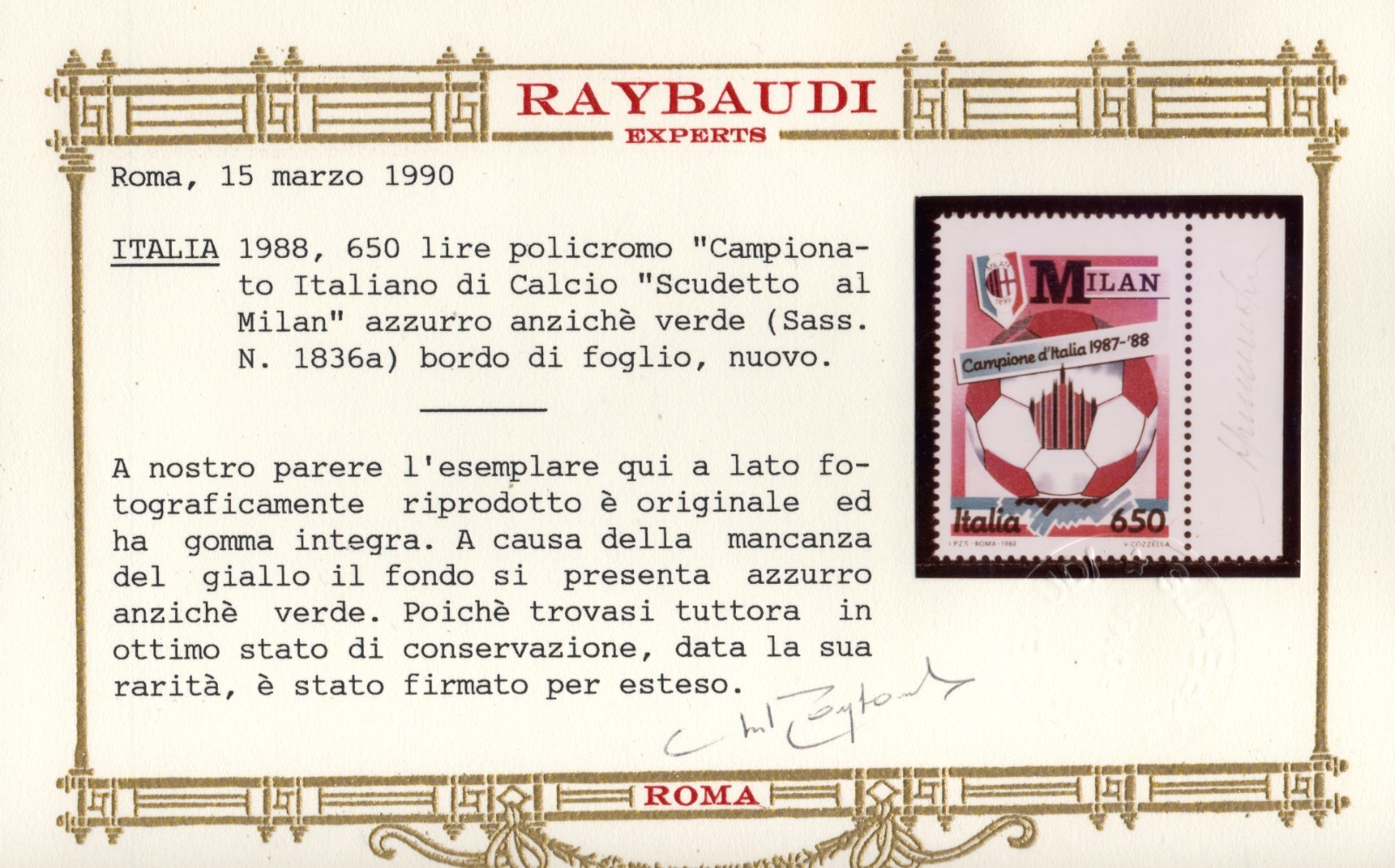 REPUBBLICA ITALIANA “MILAN” VARIETA’ SENZA GIALLO 1988 MNH CERT RAYBAUDI
