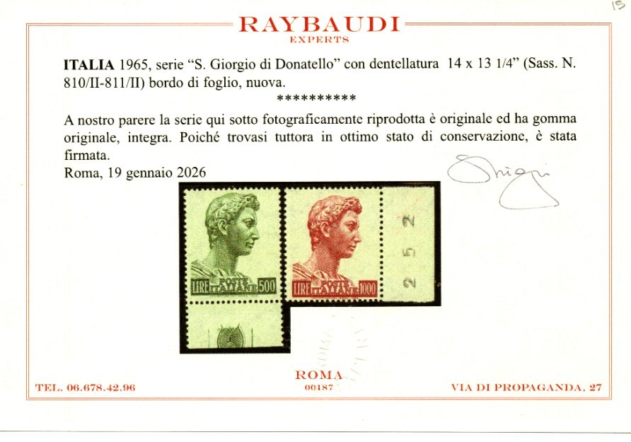 REPUBBLICA ITALIANA SAN GIORGIO DI DONATELLO VARIETA' 1965 MNH CERT RAYBAUDI quantità