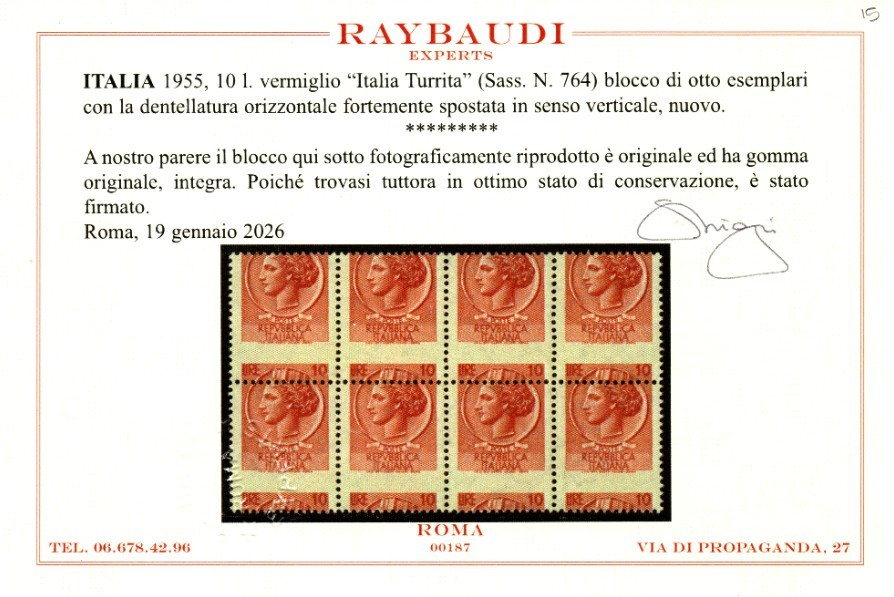 REPUBBLICA ITALIANA TURRITA 10 LIRE BLOCCO VARIETA' MNH CERT RAYBAUDI quantità