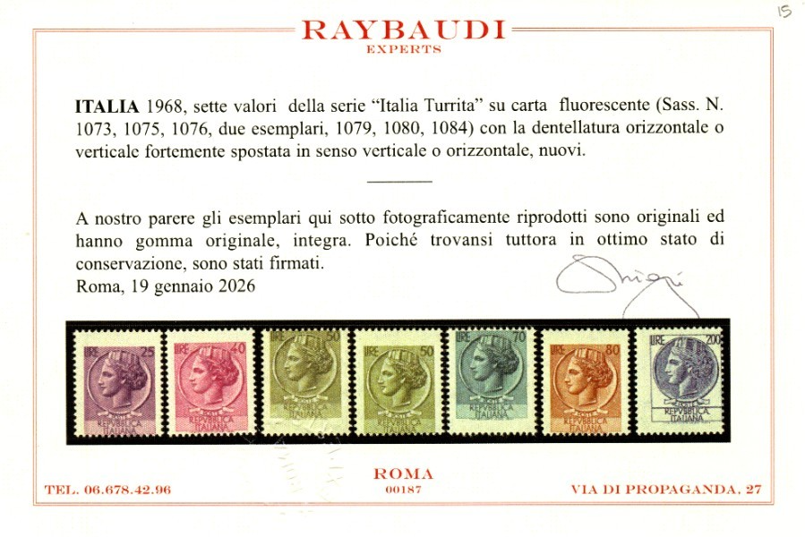 REPUBBLICA ITALIANA TURRITA VARIETA' 1968 MNH CERT RAYBAUDI quantità