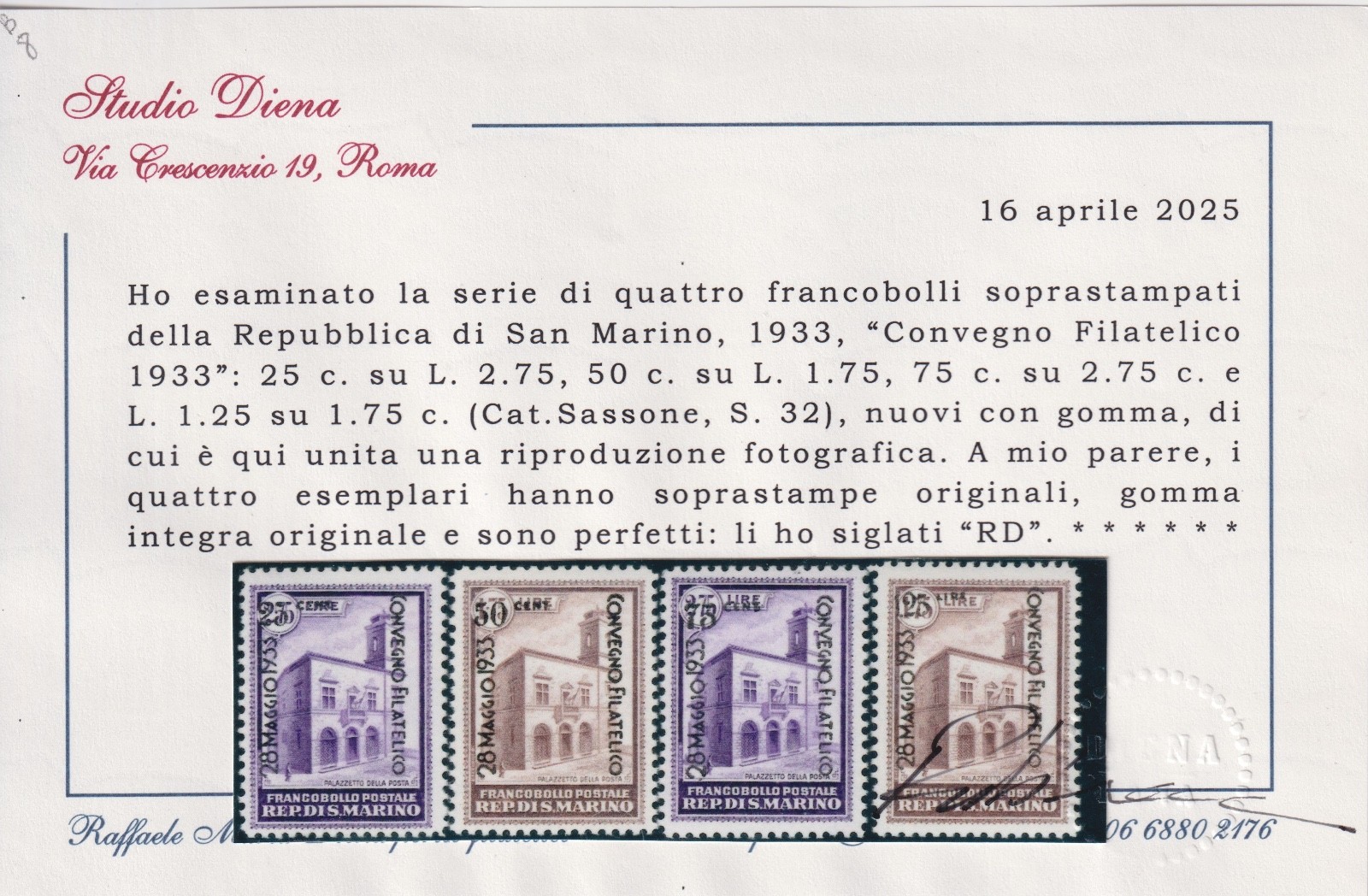 / San Marino 1933 Convegno Filatelico MNH CERT. DIENA