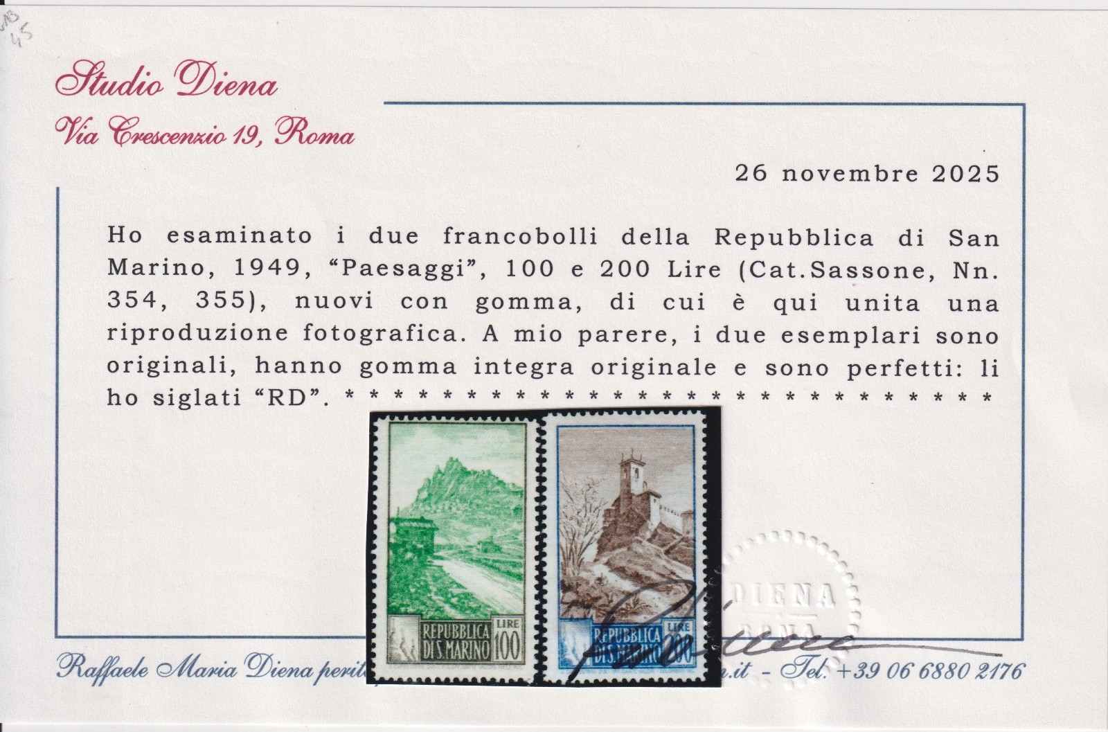 San Marino 1949 Paesaggi 2 valori MNH CERTIFICATO DIENA quantità
