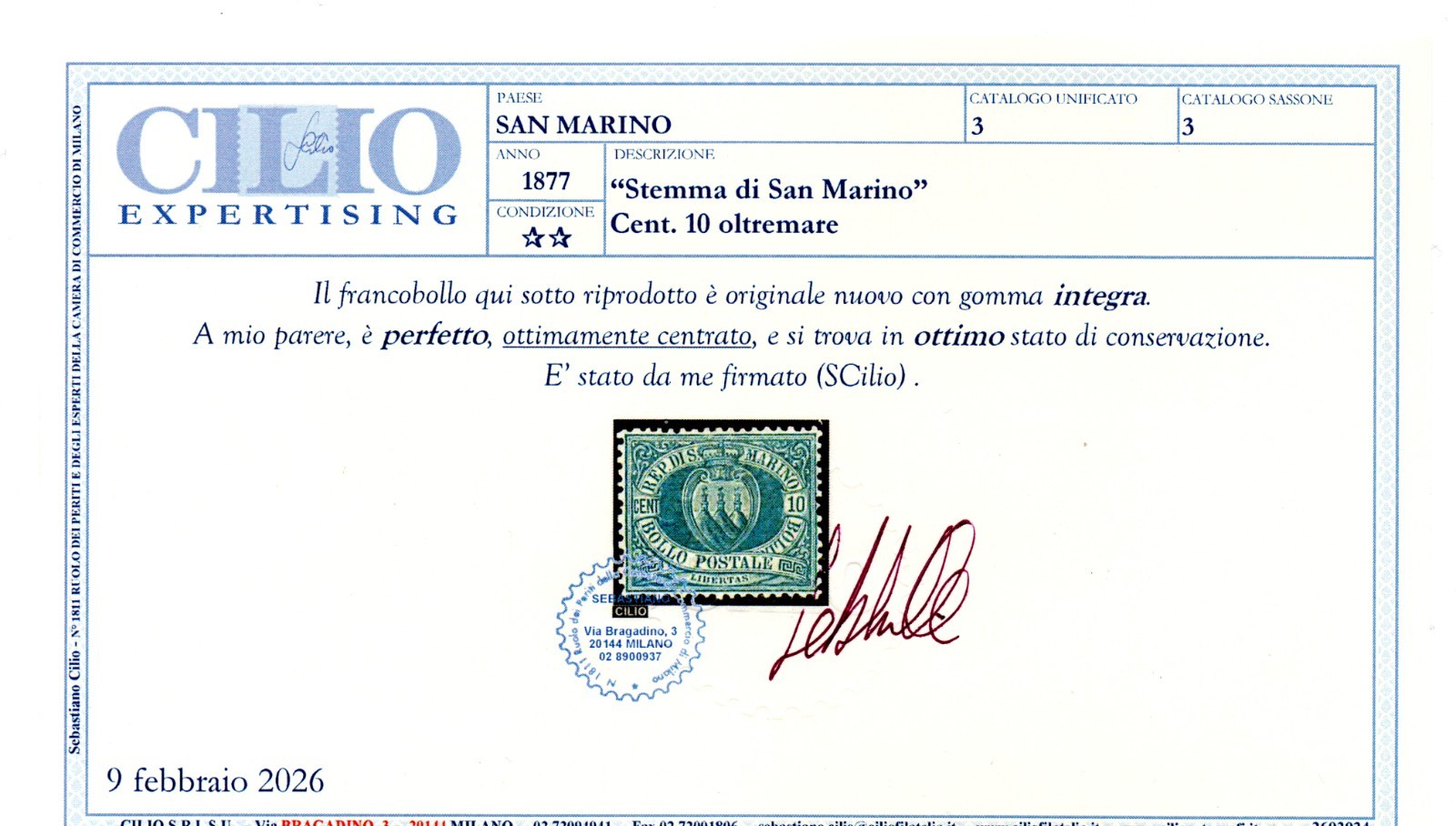 SAN MARINO STEMMA 1877 MNH CERT CILIO quantità
