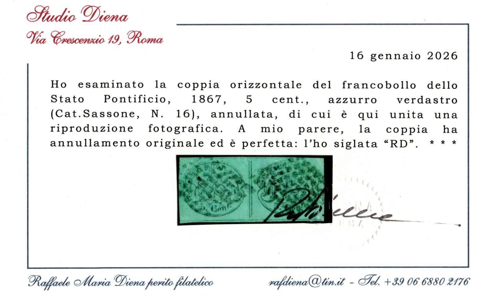 1863 FRONTESPIZIO STATO PONTIFICIO Sass. 1c CERTIFICATO DIENA